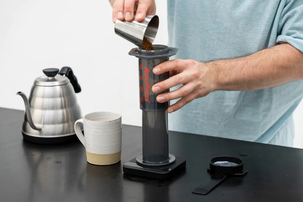 Bạn lồng hai phần ống của Aeropress lại với nhau rồi đặt ngược Aeropress lên cân. Bước tiếp theo là cho cà phê đã chuẩn bị vào lắc nhẹ sao cho lớp cà phê được bằng phẳng.